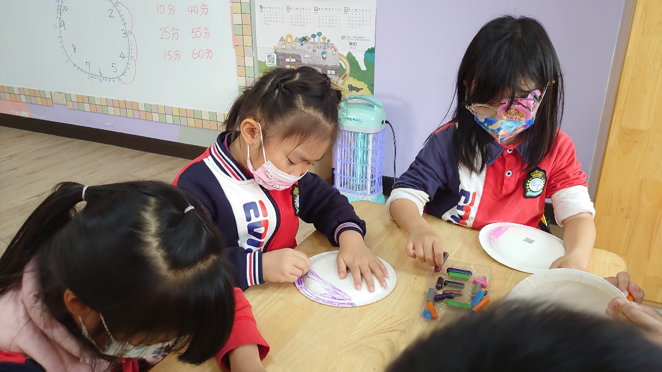 看完變色龍的故事後,請小朋友在蛋糕盤上畫出美麗的線條,老師協助剪出透明的變色龍,裝在上面即完成作品